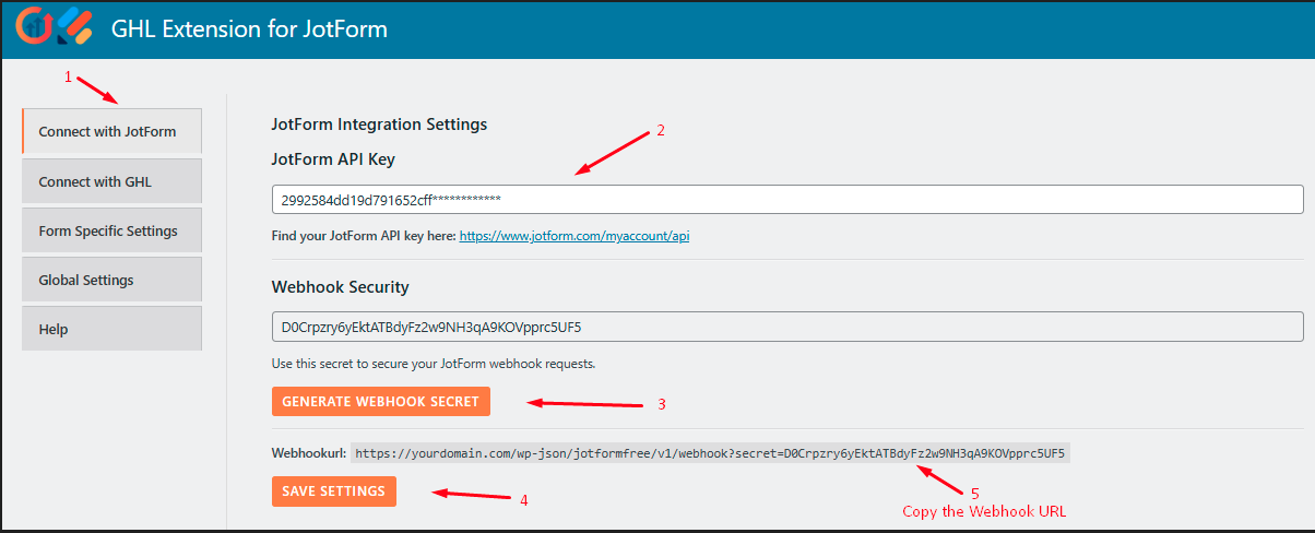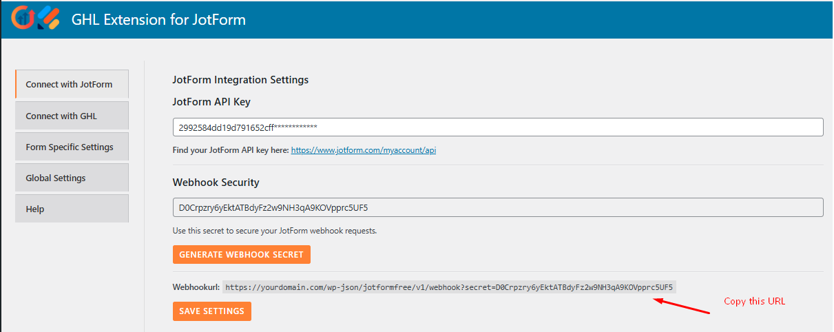 After that, generate the Webhook Secret by clicking the button. This webhook URL will be required when configuring the form specific settings, which are explained below.