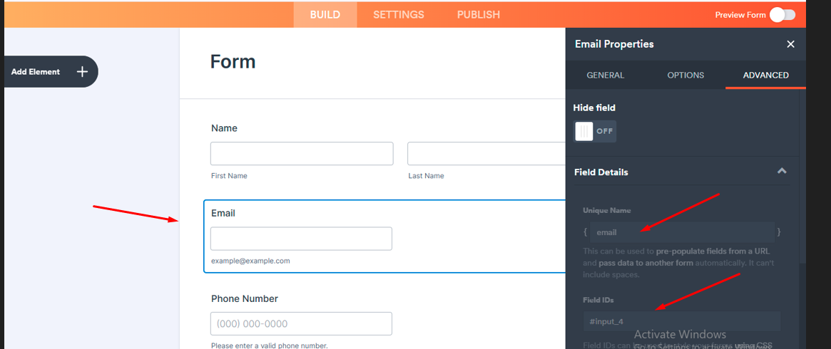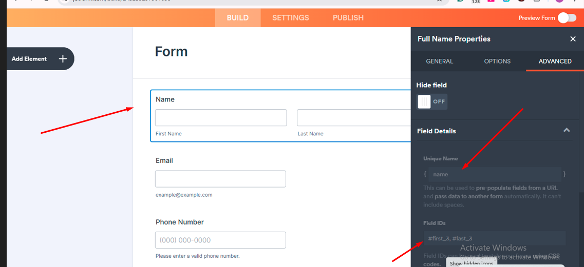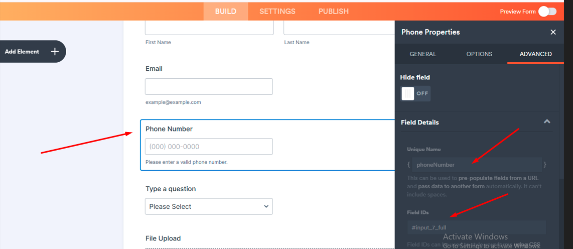 Note: To retrieve the form field values, go to the JotForm dashboard and select the same form you mapped on the plugin page. Navigate to the Form Build section in JotForm, select the fields, and then go to Advanced > Field Details.
