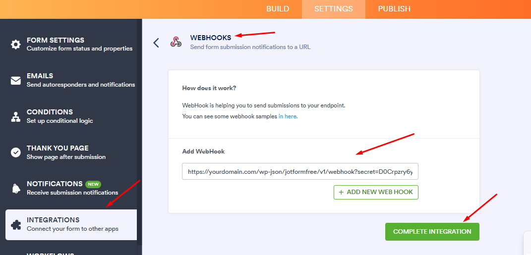 Step-b: Add the Webhook URL (for example, https://your-site-name/wp-json/jotformfree/v1/webhook ), which is available in the plugin’s “Connect with JotForm” tab, and then click Complete Integration.
