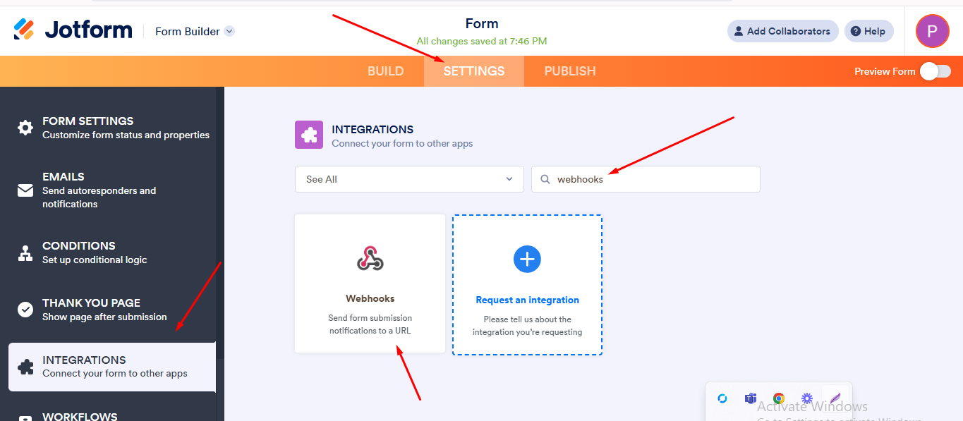 Step-a: Go to the JotForm dashboard > Select the specific form > Edit Form > Integrations > Search for 'Webhooks'.
