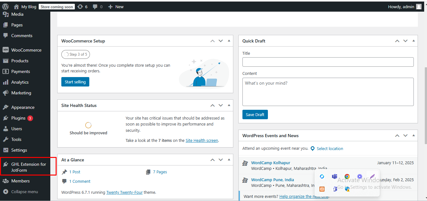 Navigate to the WordPress dashboard, and you will see the "GHL Extension for JotForm" plugin visible in the side menu.